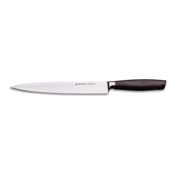 A kitchen knife for meat that is reliable for cutting, dicing or slicing, filleting poultry and fish. A 21 cm long blade and a precise blade are the qualities that characterize this high-quality knife. Made for meat portioning. Its structure and sharpness are designed to facilitate cutting of meat, including fibrous meat, and also to quickly separate it from the bones. The new collection of Felix® SMOKED OAK knives. If you ask the chef what is essential in the kitchen, the answer is: a reliable kitchen knife. Smoked oak knives are a benchmark of quality, characterized by the perfect balance between a cold, sharp blade and a wooden handle that radiates warmth and elegance. When slicing, the food does not stick to the blade which is polished to a high gloss.