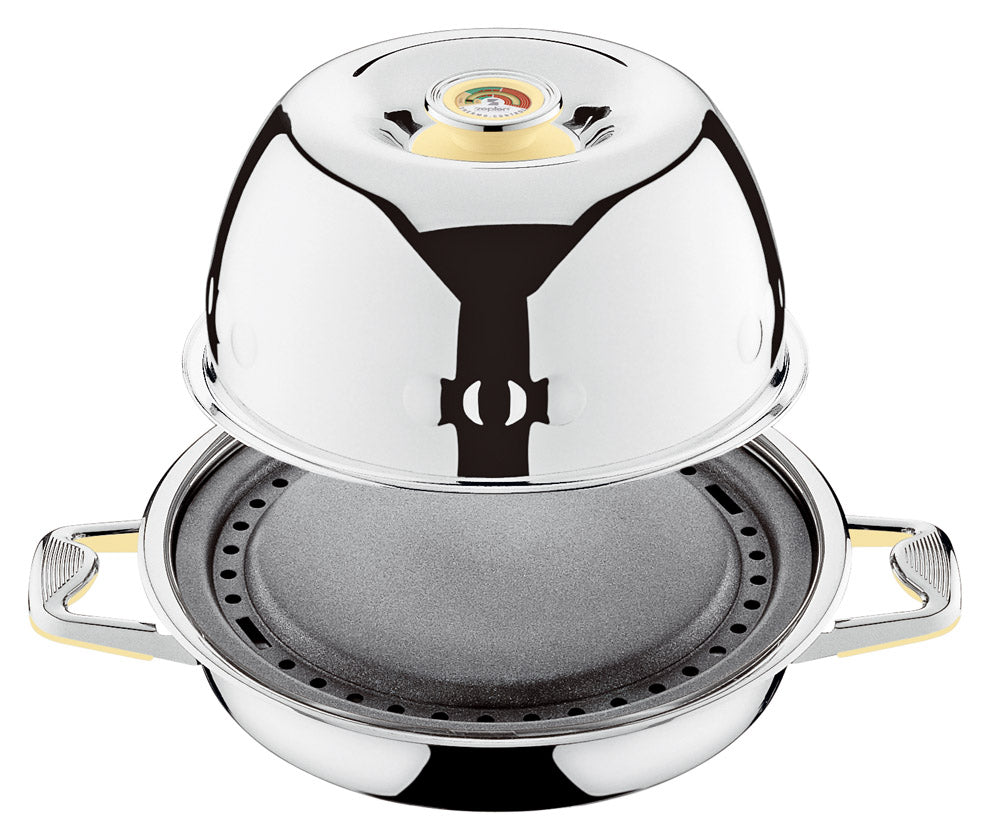 Highest quality materials: The 316L high-quality stainless steel used in the production of Masterpiece Cookware is exclusively used in applications where material quality matters the most: in surgical instruments, body implants, exclusive watches and other luxury products. This specific type of steel is non-porous, does not burn food while cooking, does not oxydise, does not retain food odours, causes no allergies and it is easy to clean. These qualities make it ideal for cooking food in a healthy way. And when the Syncro-Clik® lid is added, the highest quality cooking vessels are turned in a turbo cooking experience.
