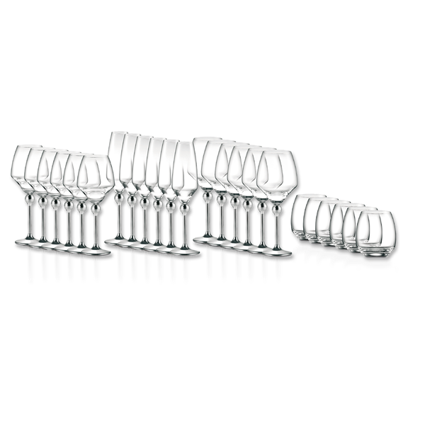 The 24-piece Magic Harmony Stainless Steel drink set includes red and white wine glasses, Champagne or sparkling wine flutes and water/whiskey glasses. The goblets are made of ecological and lime scale resistant crystalline glass, with a perfect balance, feel and weight in-hand. The crystal enhances the colour and aroma of red and white wines, and encapsulates the flavour and character of other drinks. The glasses are lead-free, yet with the same resonance, resilience and brilliant clarity as fine crystal, but lighter in weight. The versatile stems can be matched to all sets of goblets and are available in either the elemental natural steel colour or in the colour of gold to give an opulent aesthetic to your drinking glass.