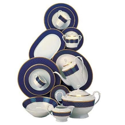 The stunning 68 pieces for 12 people in the Cobalt Royal set add a touch of class to the table with a richness of shape and hue in a three-color set of striking elegance. A rich blue tone is displayed within an extraordinary optical balance of 22 carat gold-filled fields against a white, neutral porcelain background. There are few patterns that live up to the richness of the Cobalt Royal Porcelain design.