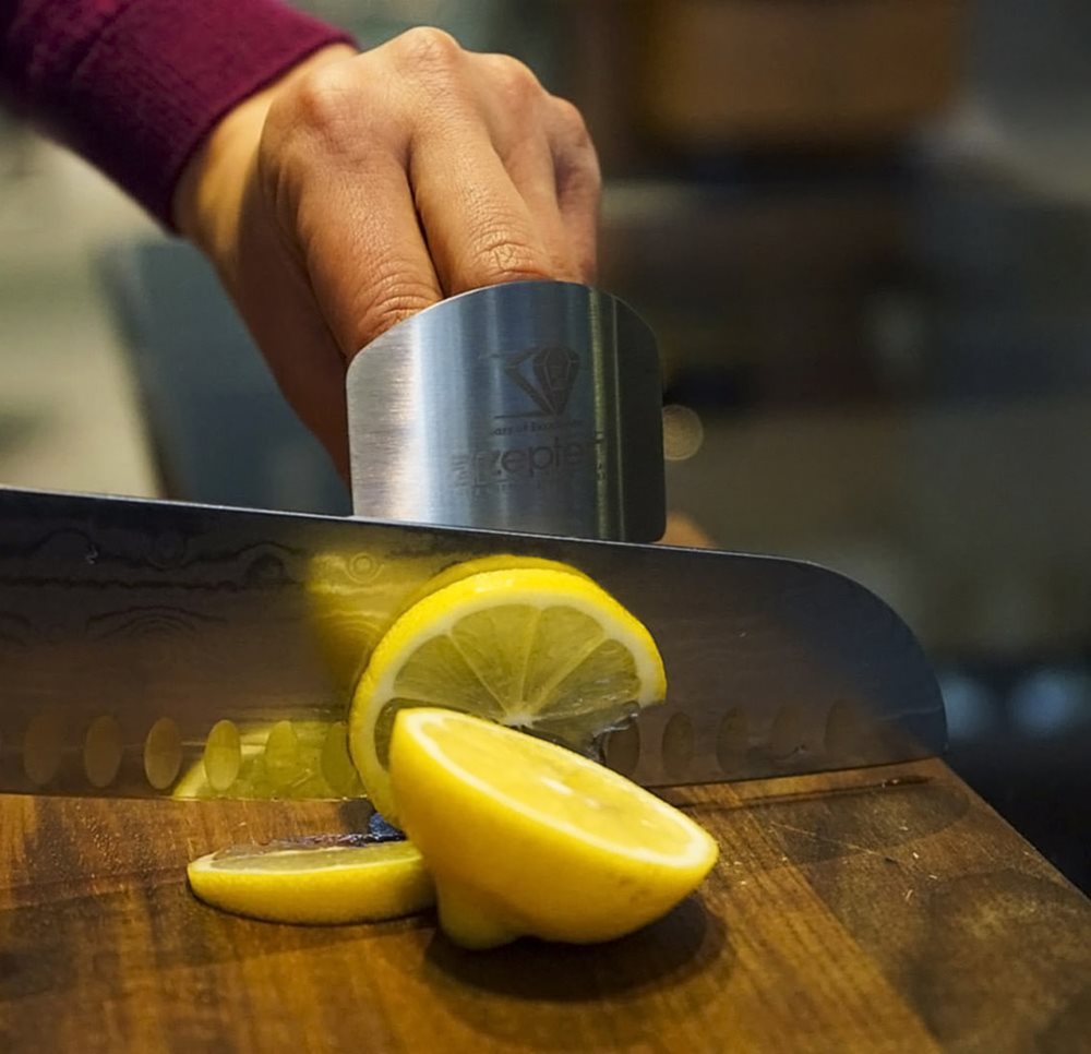 Made of stainless steel the finger guard protects your fingers while cutting and slicing. The metal shield has on the interior a welded ring that comfortably adjusts to fit on the middle finger, thus leaving all other fingers free to manipulate the food. Safe and easy to use, the Finger Guard keeps away unwanted injuries.