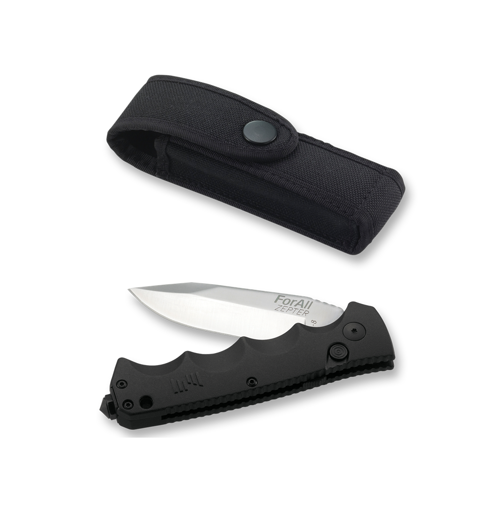 The universal Zepter ForAll pocket knife is light, compact and durable. The blade is made of high-quality Japanese AUS-8 stainless steel enriched with carbon and vanadium, making it very resistant and durable. The ergonomic handle is made of light aluminum, which ensures excellent grip and ease of use. A safety lock with a simple release mechanism protects the knife from accidental opening.