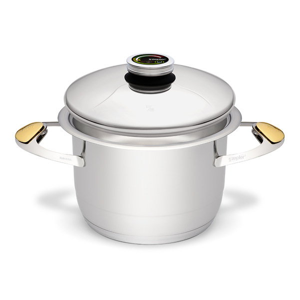- UNIQUE COOKING PROCESS: Zepter has developed a coking process where the steam released by the food rises to the top, condenses upon contact with the lid, which is always cooler than the rest of the pot, and drips down onto the food. The process goes on undisturbed, until the food is perfectly cooked. This is called the Zepter Closed Circle, and it guarantees healthy food preparation, without adding water or fats, and always at low temperatures. Not only is food cooked in this way healthier, it also tastes better because the natural flavours and aromas have been preserved, (even without adding salt and spices). The food also looks better because the colour, shape and texture are maintained.