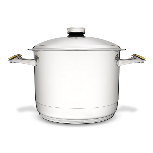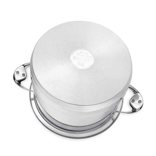 Considerably heavier than most conventional lids, it fits perfectly onto the pot edge, hermetically sealing the pot during the cooking by a water seal, which assists the Zepter Closed Circle process and at the same time prevents the spoilage of food. The Zepter Lid can also be rested on the Zepter patented Handles, which saves countertop space.