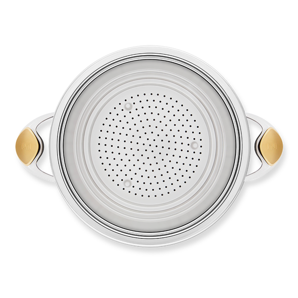 The multipurpose steamer is perfect for rinsing vegetables and fruit, as well as for draining pasta, vegetables and other ingredients. It also doubles as part of Zepter’s innovative Stacking System for steam cooking, while the highest-quality Zepter Superior Metal 316L ensures a healthy cooking process. Just place the steamer on top of a pot of the same diametre, and easily steam vegetables or fish while another dish is cooking on the bottom level of the system on the same heat source.